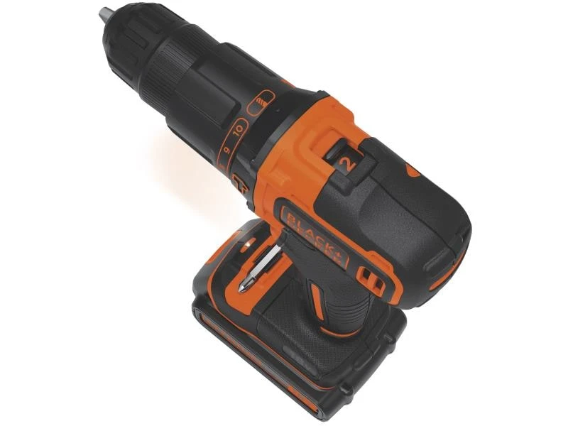 Der Akku-Schlagbohrschrauber BDCHD18K von BLACK+DECKER bietet die Kraft und die Geschwindigkeit, um in Holz und Metall zu bohren. Die Hammer Action ermöglicht ausserdem das Bohren in Gemäuer und Beton. Der Schlagbohrer besitzt ein Zweigang-Getriebe, mit hoher Drehzahlt durchdringen Sie mühelos Holz und Metall, während Sie mit niedriger Drehzahl kontrolliert arbeiten können. Für kraftvolles und präzises Bohren dienen die zehn Drehmomentstufen. Während der Arbeit erleuchtet eine LED Ihren Arbeitsbereich.