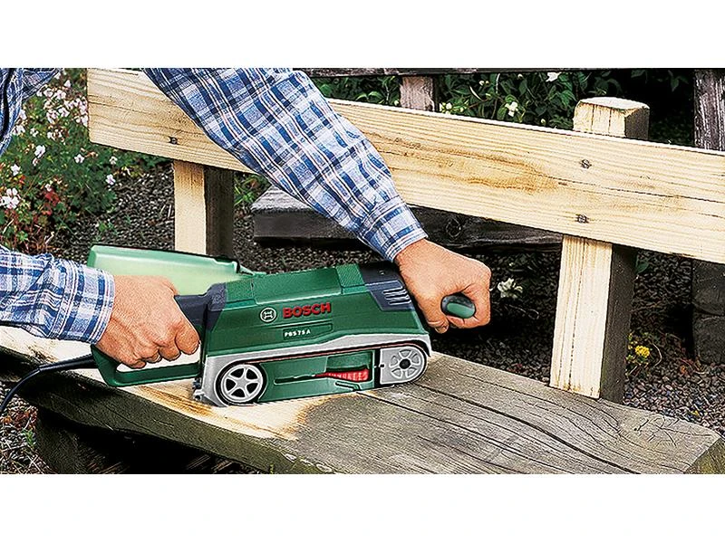 Der Bosch PBS 75 A Bandschleifer überzeugt bei der Durchführung anspruchsvoller Schleifprojekte durch einen hocheffizienten Materialabtrag und eine bequeme Handhabung. Der leistungsstarker 710-W-Motor sorgt für schnellen Fortschritt auf grösseren ebenen Flächen. Das Schleifband kann mittels SDS-Systems leicht gewechselt werden und das automatische Bandsystem zentriert es während Arbeitsvorganges. Der Schleifer eignet sich für das Schleifen von Oberflächen mit Anstrich, z. B. Türen oder grösserer Oberflächen, wie Tische und Bodendielen, für die Bearbeitung lackierter Oberflächen und Vorschleifen rauer Oberflächen, z. B. unbehandelte Balken. Damit ist er die perfekte Wahl bei Vorbehandlungs- oder Sanierungsarbeiten beim Heimwerken. Eine Microfilter-Staubbox reduziert Staub und sorgt damit für einen deutlich saubereren Arbeitsbereich, das Werkzeug kann auch an einen Staubsauger angeschlossen werden.