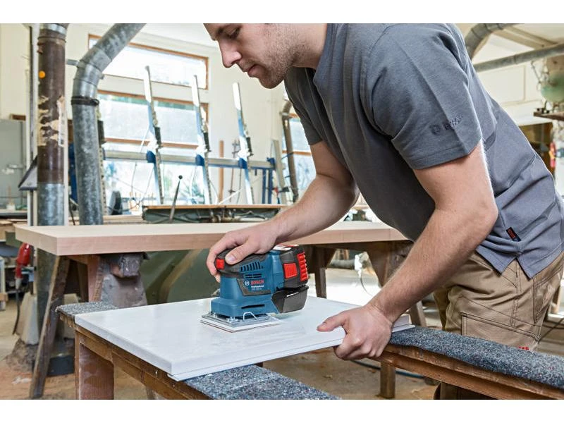 Mit dem 18-Volt-Akku-Schwingschleifer GSS 18V-10 von Bosch Professional erledigen Sie mühelos eine Vielzahl an Schleifarbeiten. Dank seiner kompakten Bauform erreichen Sie jede Ecke. Die Schleifplatte kann sowohl Klett- als auch Klemmpapier aufnehmen und hält es sicher, sodass es weder flattert noch reisst. Dank des Microfilter-System wird der entstehende Schleifstaub effizient abgesaugt. Abgedichtete Kugellager und die robuste Bauweise garantieren eine lange Lebensdauer.