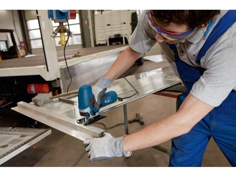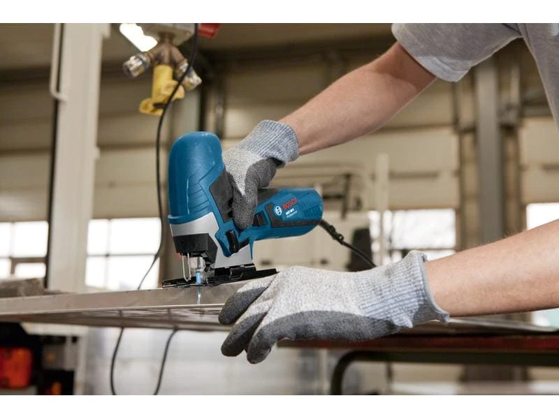Eine Stichsäge ist eine handgeführte Maschine mit schmalem Sägeblatt. Sie eignet sich ideal zum Schneiden von Ausschnitten, geschwungenen Formen und Erweitern kleiner Öffnungen. Das eingespannte Sägeblatt schneidet Werkstoffe mittels Hubbewegungen.