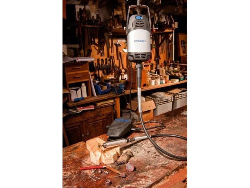 Der Dremel Fortiflex ist ein hochwertiges Präzisionswerkzeug, das mit umfangreicher Funktionalität und Ausstattung brilliert. Das Set besteht aus einem kraftvollen Hängemotor mit 300 W Leistung, einer hochbelastbaren, biegsamen Welle, einem auswechselbaren Präzisionshandstück, einem Fusspedal zur stufenlosen Drehzahlregelung (0 – 20’000 U/min) und zahlreichen Zubehörteilen. Für stationäre Projekte wie Holzarbeiten, Schmuckherstellung, Steinarbeiten, Autorestaurierung und alle Arbeiten, bei denen eine Kombination aus Kraft und Präzision gefordert ist, ist der Fortiflex ein ideales Werkzeug.