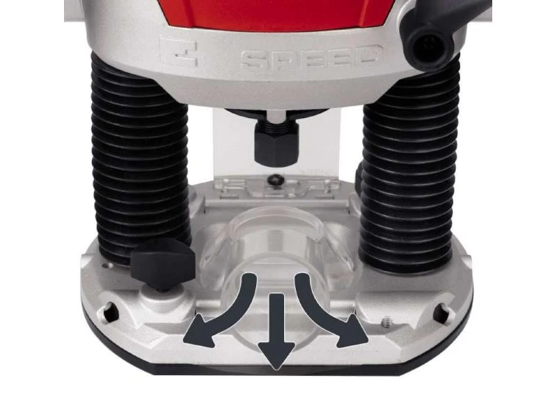 Die Oberfräse RT-RO 55 von Einhell liegt äusserst gut in der Hand. Die ergonomischen Griffe liegen angenehm in der Hand. Der Arretierhebel ist leicht zu erreichen und gewährleistet eine einfache und sichere Bedienung. Die Frästiefe lässt sich leicht über drei Revolveranschläge einstellen und mittels Tiefeneinstellung exakt nachjustieren. Ein Späneschild schützt den Benutzer und der Kabelclip fixiert das Elektrokabel nach getaner Arbeit.