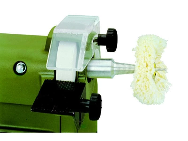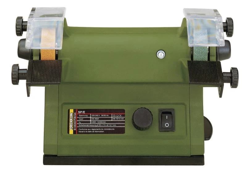 Das Schleif- und Poliergerät SP/E mit elektronisch regelbarer Schleifgeschwindigkeit ist auch für das Bearbeiten von längeren Werkstücken geeignet. Durch Stopper für die Wellenblockierung können die Schleifmittel leicht ausgewechselt werden. Inklusive einer Scheibe in 50 x 13 mm aus Edelkorund und einer Scheibe aus Silicium-Karbid. Der Anschluss für Staubabsaugung ermöglicht sauberes, staubfreies Arbeiten.